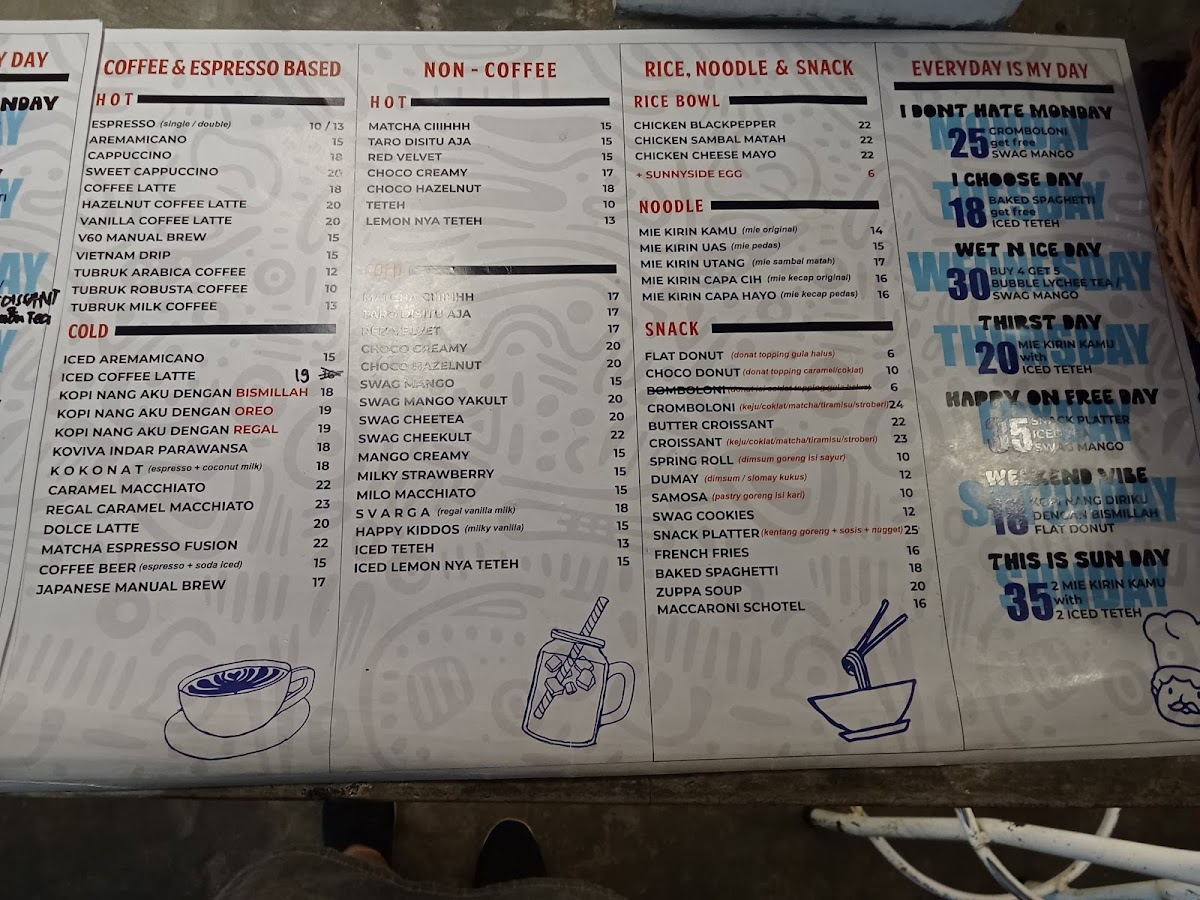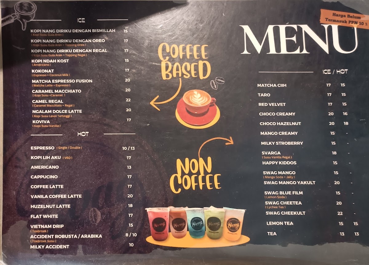 Welcome to SWAG COFFEE Co. Space, where coffee culture meets comfort. Nestled in the heart of Malang, this vibrant café invites you to indulge in exceptional brews and a delightful menu that evolves daily. Customers rave about their experiences, praising the delicious coffee, with a special nod to the V60 brew that's sure to delight any coffee aficionado.